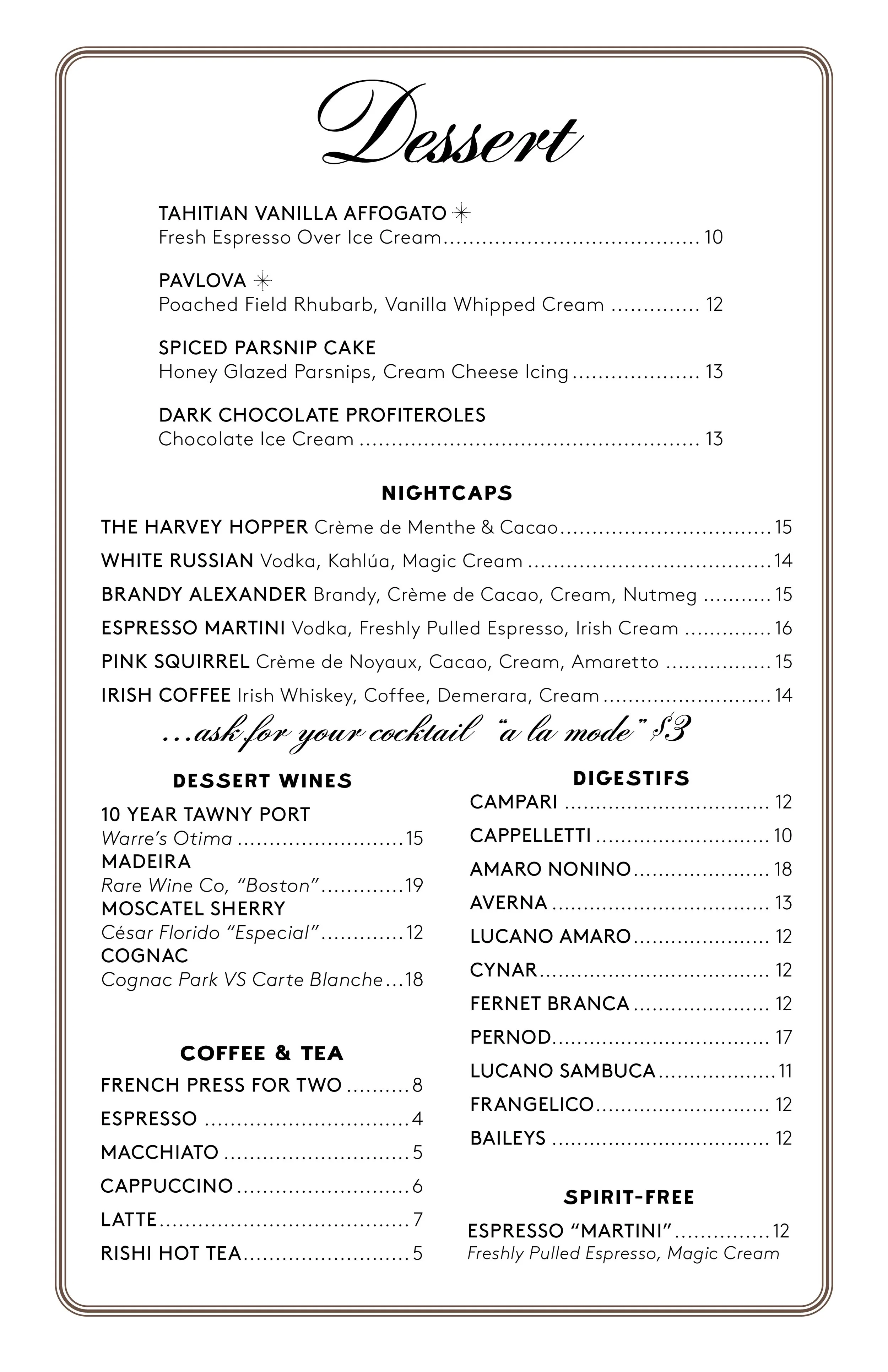 menu please note: the menu is subject to change Click here to view the menu as a pdfclick here for our vegetarian menuClick Here for Our Complete Beverage Menu make a reservation make a reservation